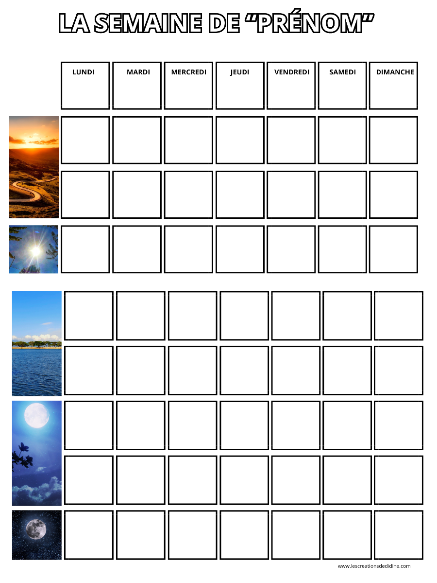 Vous avez le choix à plusieurs thèmes que vous pouvez personnalisé comme « le semainier de » avec le prénom de votre enfant.